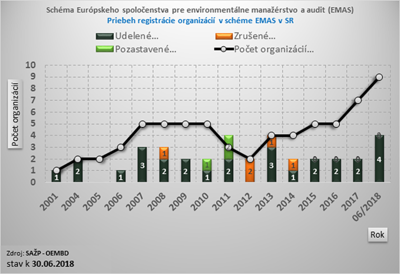 K 31. decembru 2023 je v národnom registri EMAS zapísaných 110 organizácií so 198 miestami a 5 organizácií pod združenou registráciou EÚ s 5 miestami v SR.