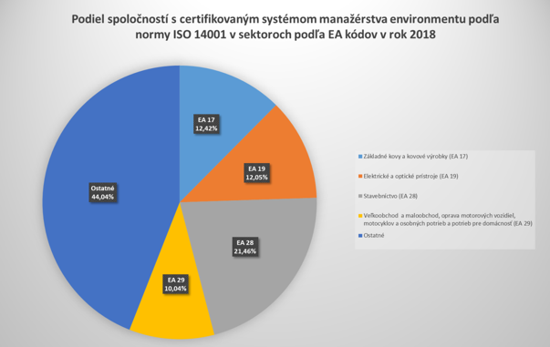 V roku 2018 malo v SR zavedený a certifikovaný EMS podľa normy ISO 14001 celkovo 662 spoločností s nasledovným podielom v jednotlivých sektoroch v členení podľa EA kódov v sektore stavebníctvo (EA 28) s 21,46% podielom, nasleduje sektor základné kovy a kovové výrobky (EA 17) s podielom 12,42%, sektor elektrické a optické prístroje (EA 19) s podielom 12,05% sektor veľkoobchod a maloobchod (EA 29) s podielom 10,04% a ostatné sektory, ktoré spolu predstavovali 44,04%.